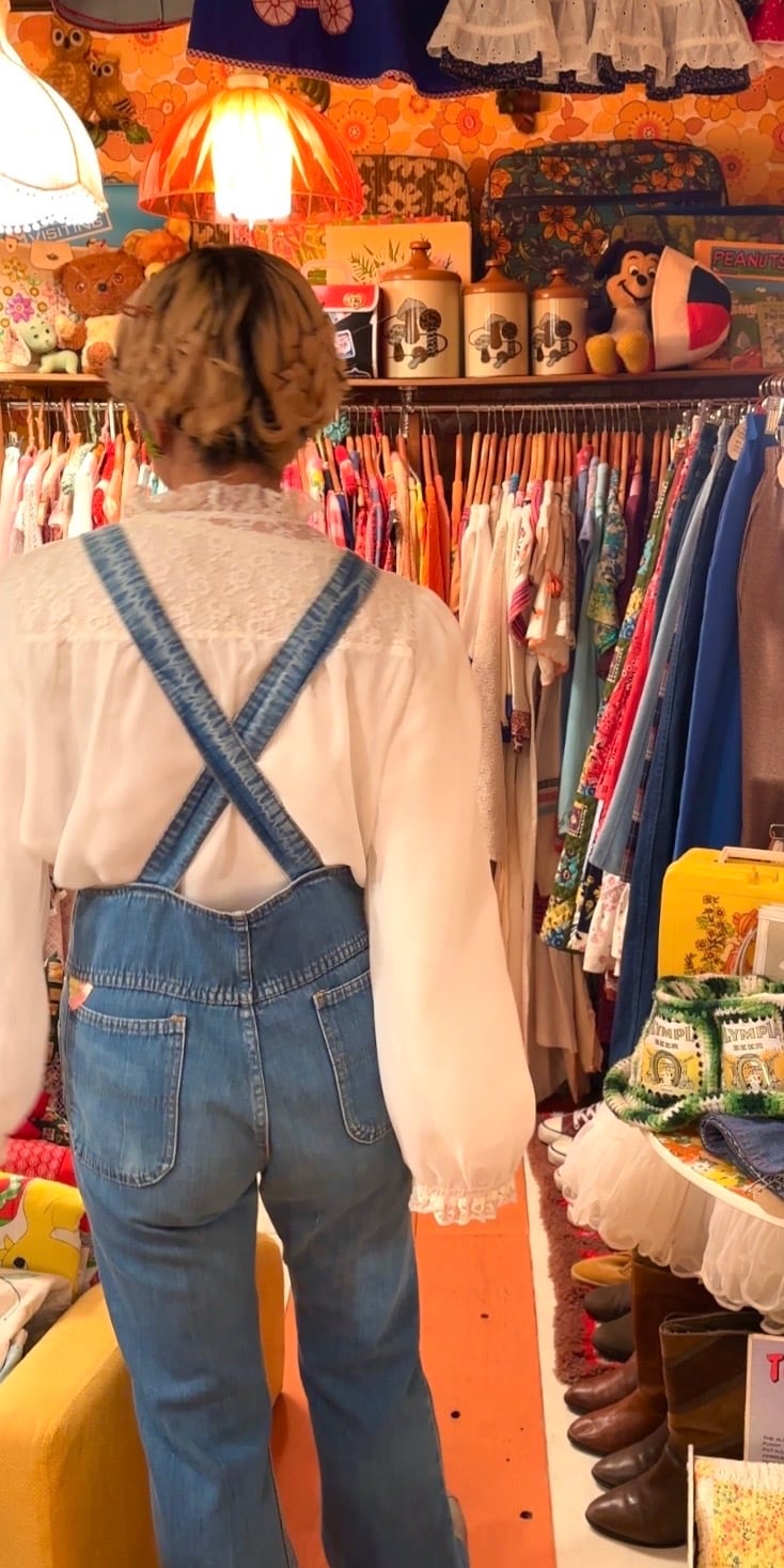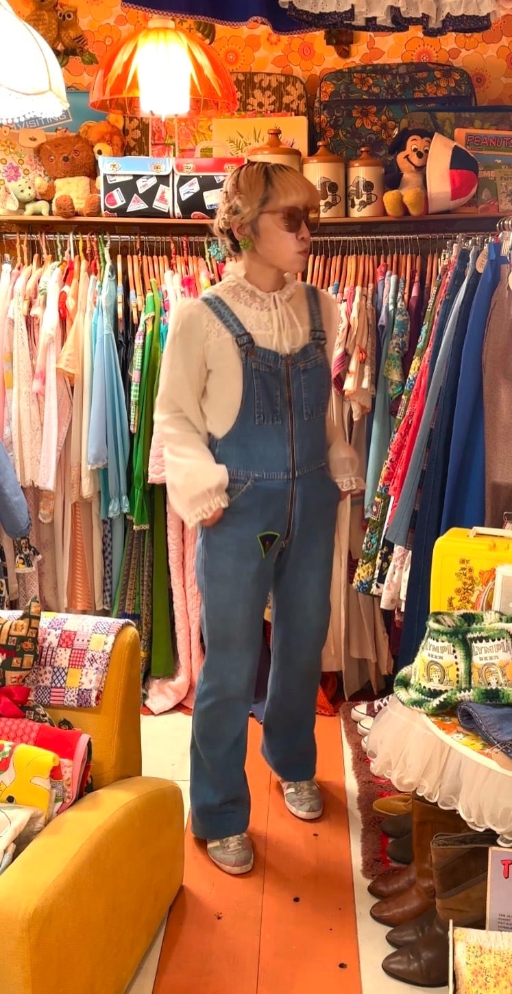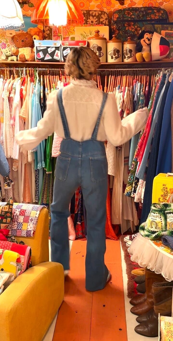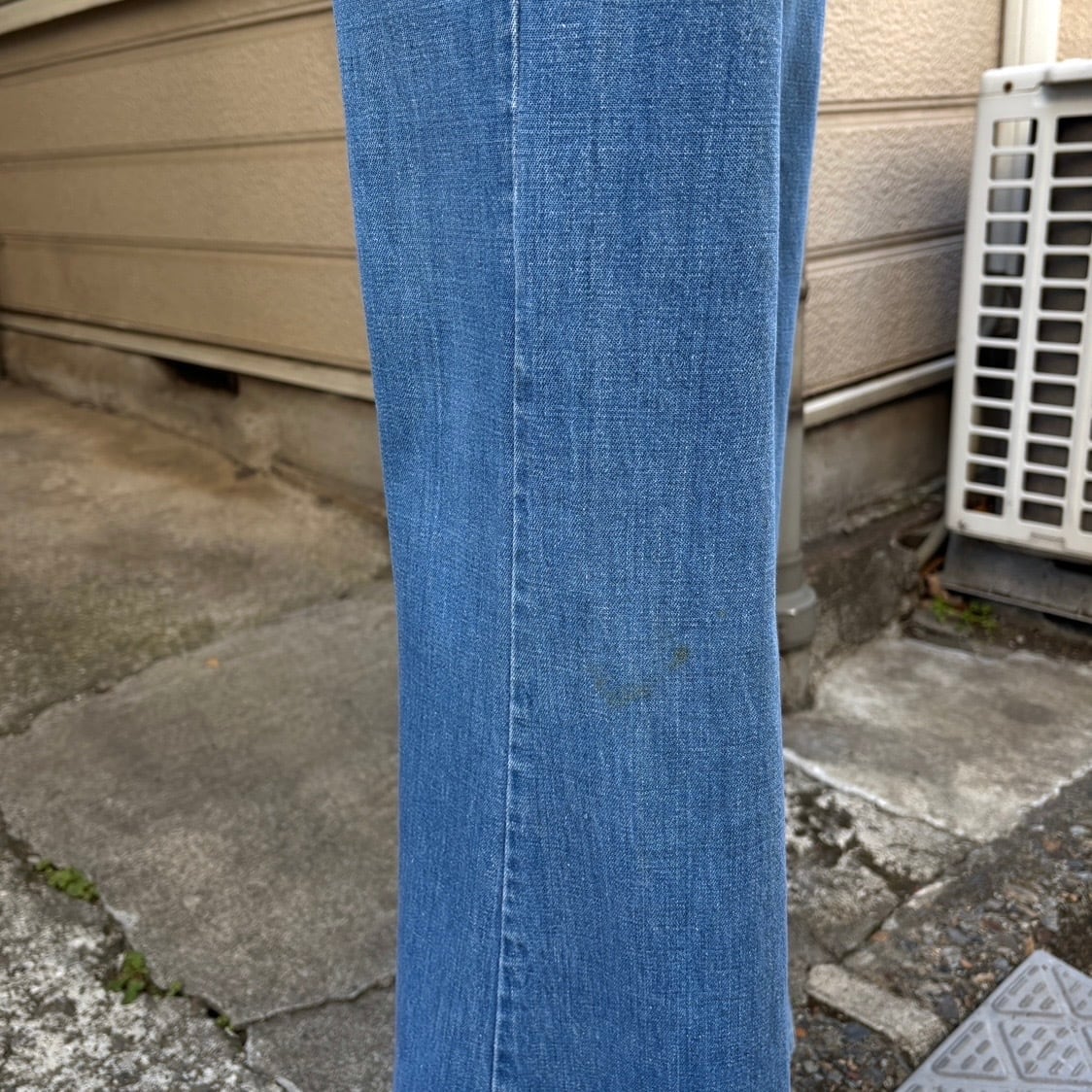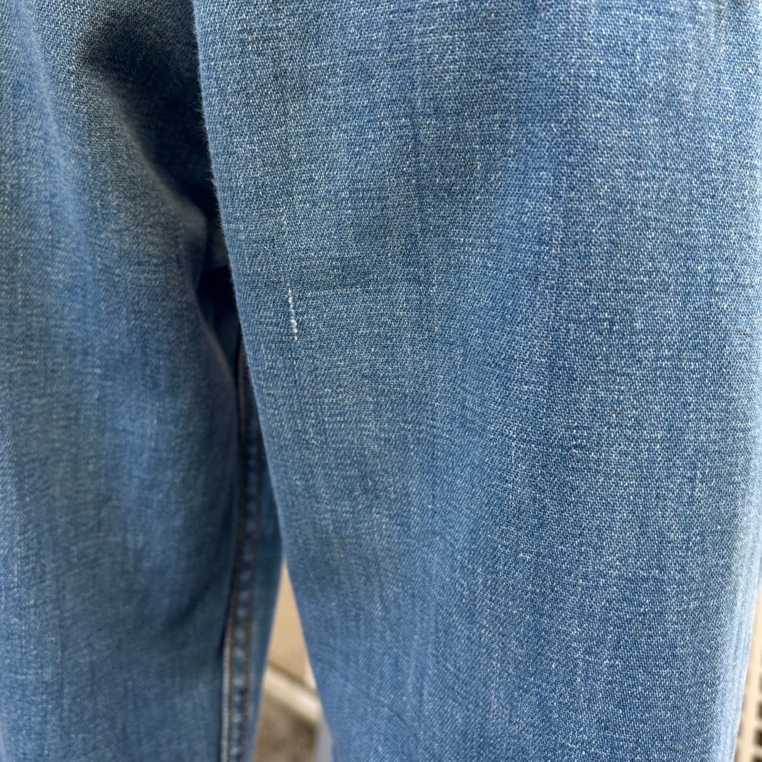 背面側左足やに薄っすらとしたシミ、背面側右足に引っ掛かりのような線のような擦れや股下にシミ、背面側のショルダー紐の縫い目にリペア、股の中央に縫い目のリペア、ヴィンテージデニム特有の色むらや色褪せ、所々僅かな生地の擦れ、背面側の裾に生地の擦れなど多少の経年感はありますが、ヴィンテージのあじとして捉えて頂けたらと思います。