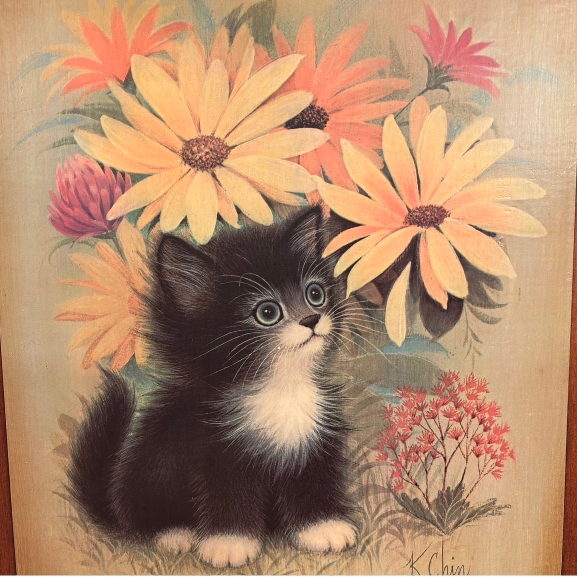 60'S Vintage kitten&flower wall hanging