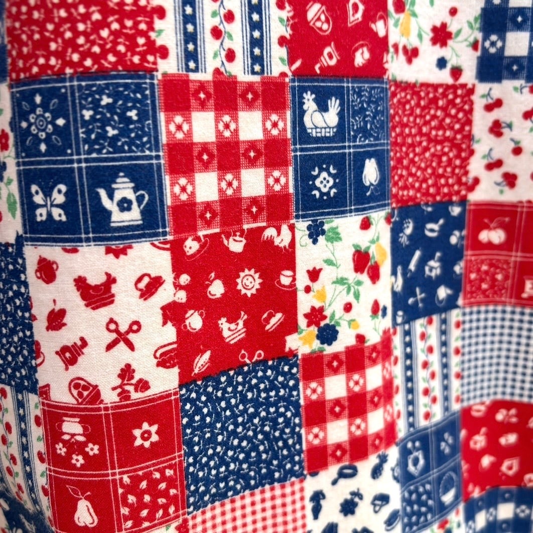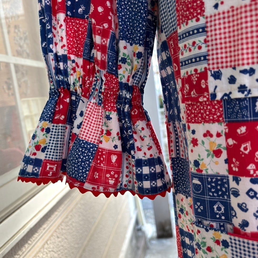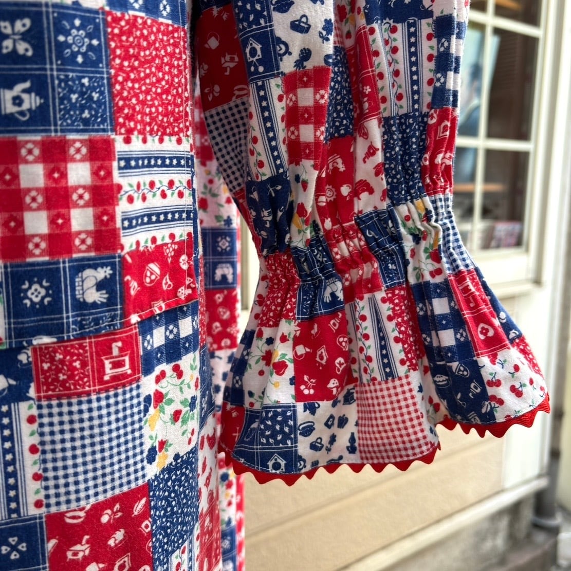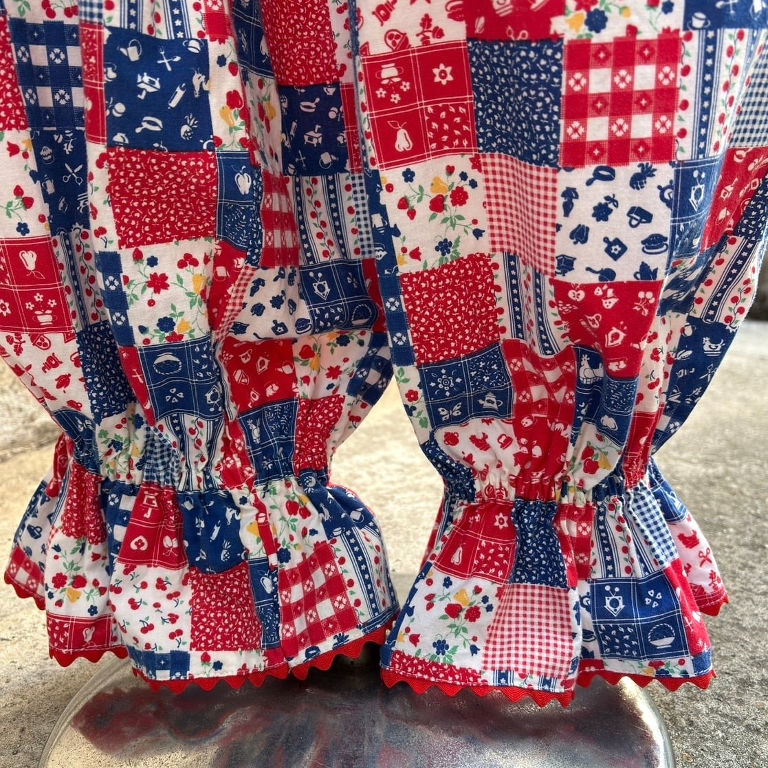 レッド、ネイビー寄りのブルー、ホワイトベースのカラーリングやイチゴやチェリーなどのフルーツ柄やフラワー柄、ギンガムチェックや家具やカトラリー柄のパッチワークプリント、オールインワンなデザインがとっても可愛い1着です。