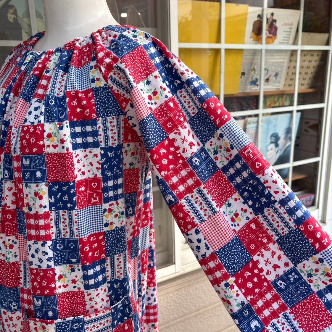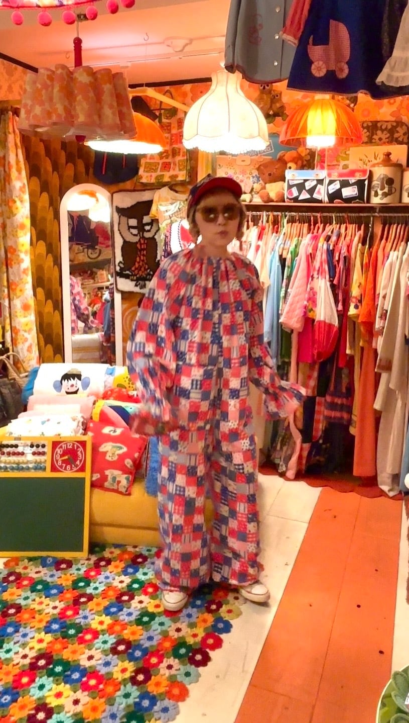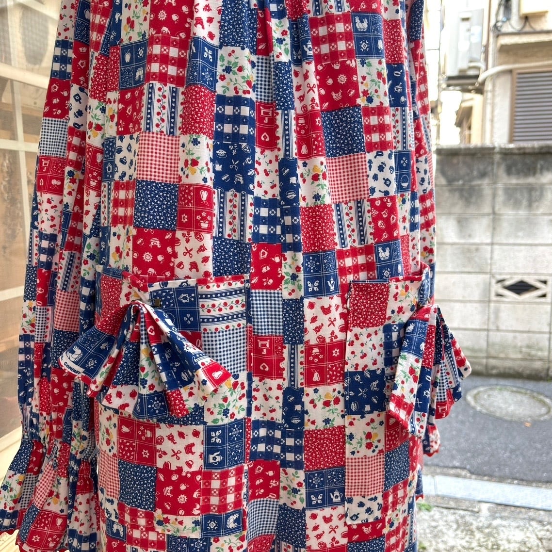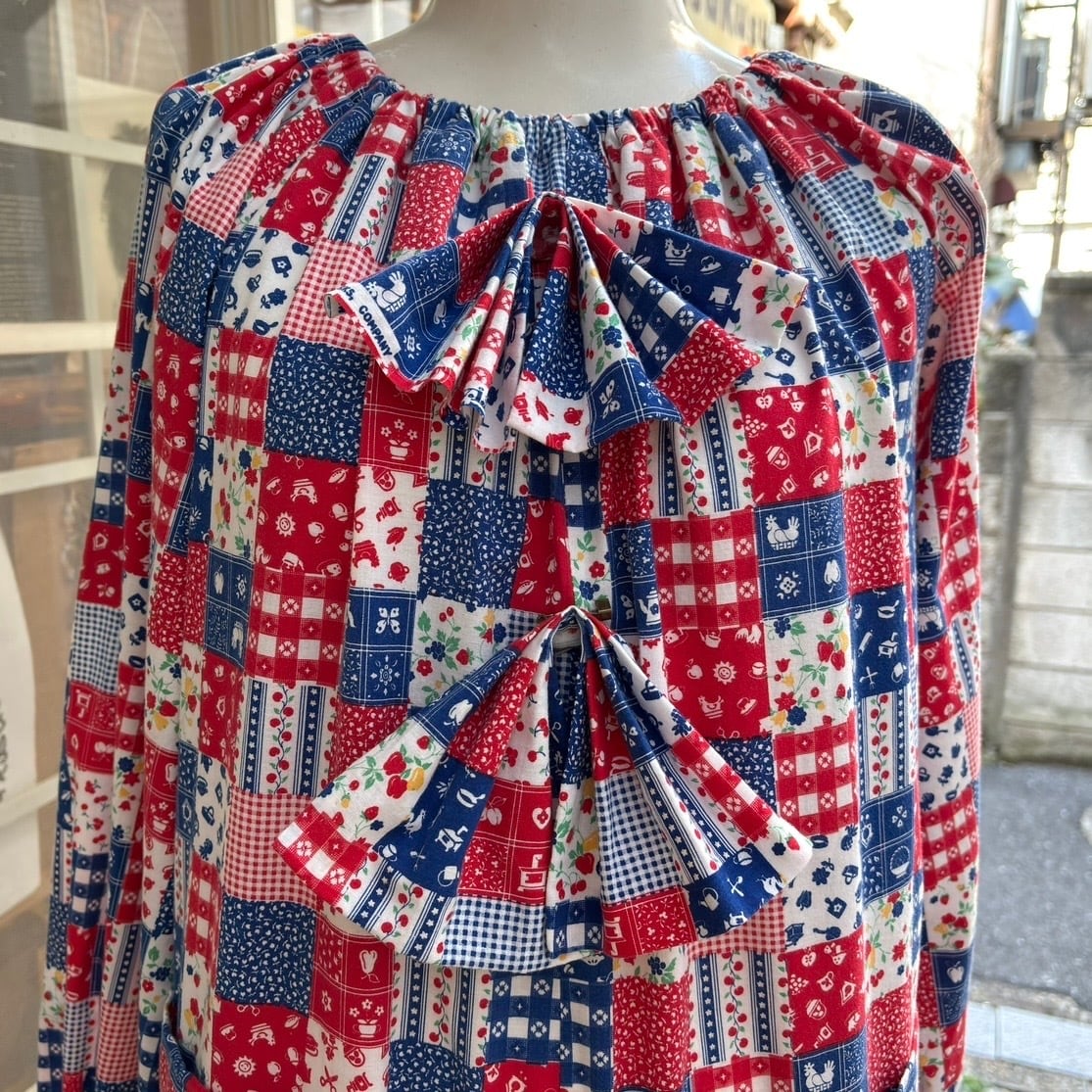 レッド、ネイビー寄りのブルー、ホワイトベースのカラーリングやイチゴやチェリーなどのフルーツ柄やフラワー柄、ギンガムチェックや家具やカトラリー柄のパッチワークプリント、オールインワンなデザインがとっても可愛い1着です。