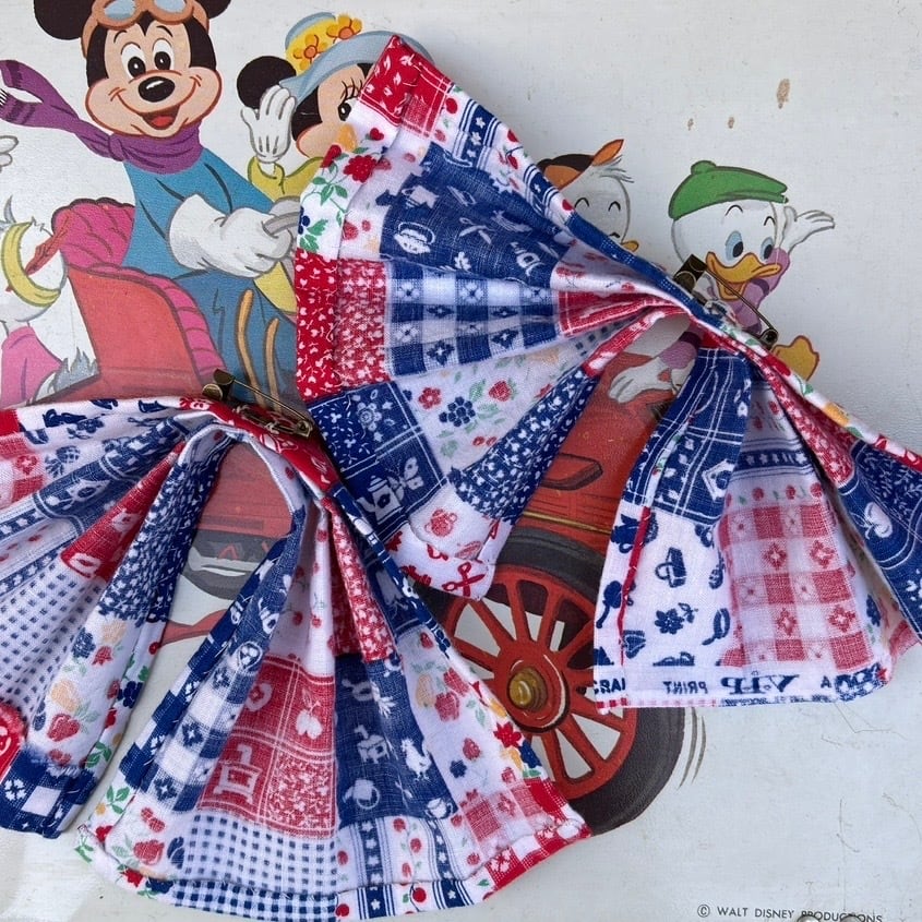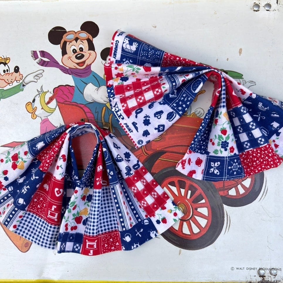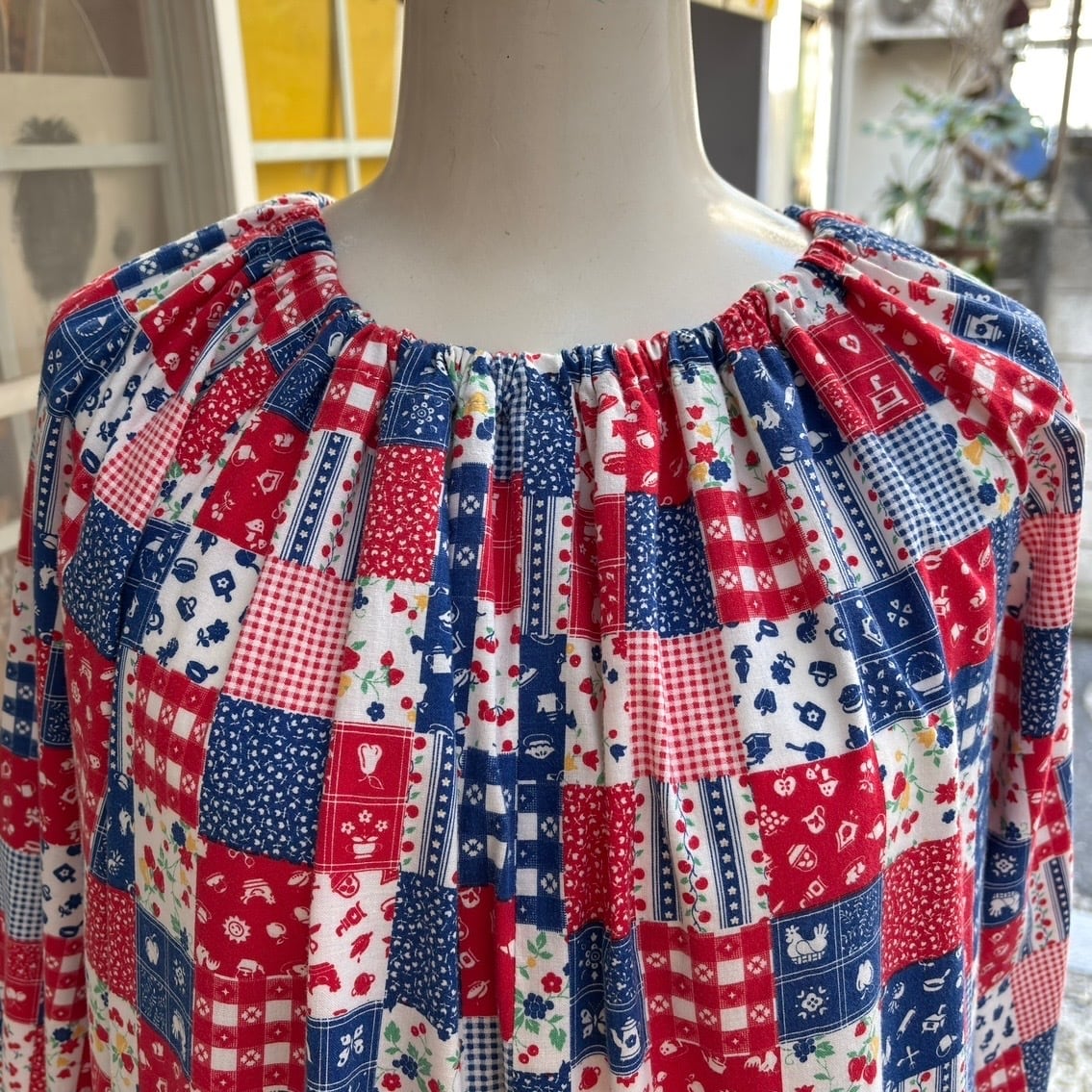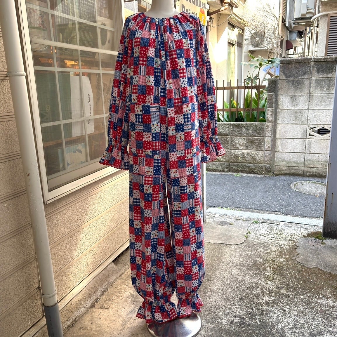 レッド、ネイビー寄りのブルー、ホワイトベースのカラーリングやイチゴやチェリーなどのフルーツ柄やフラワー柄、ギンガムチェックや家具やカトラリー柄のパッチワークプリント、オールインワンなデザインがとっても可愛い1着です。