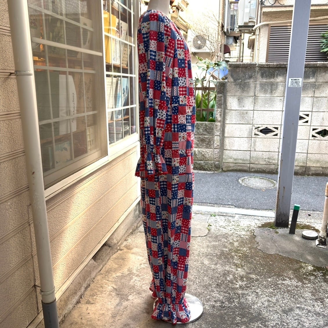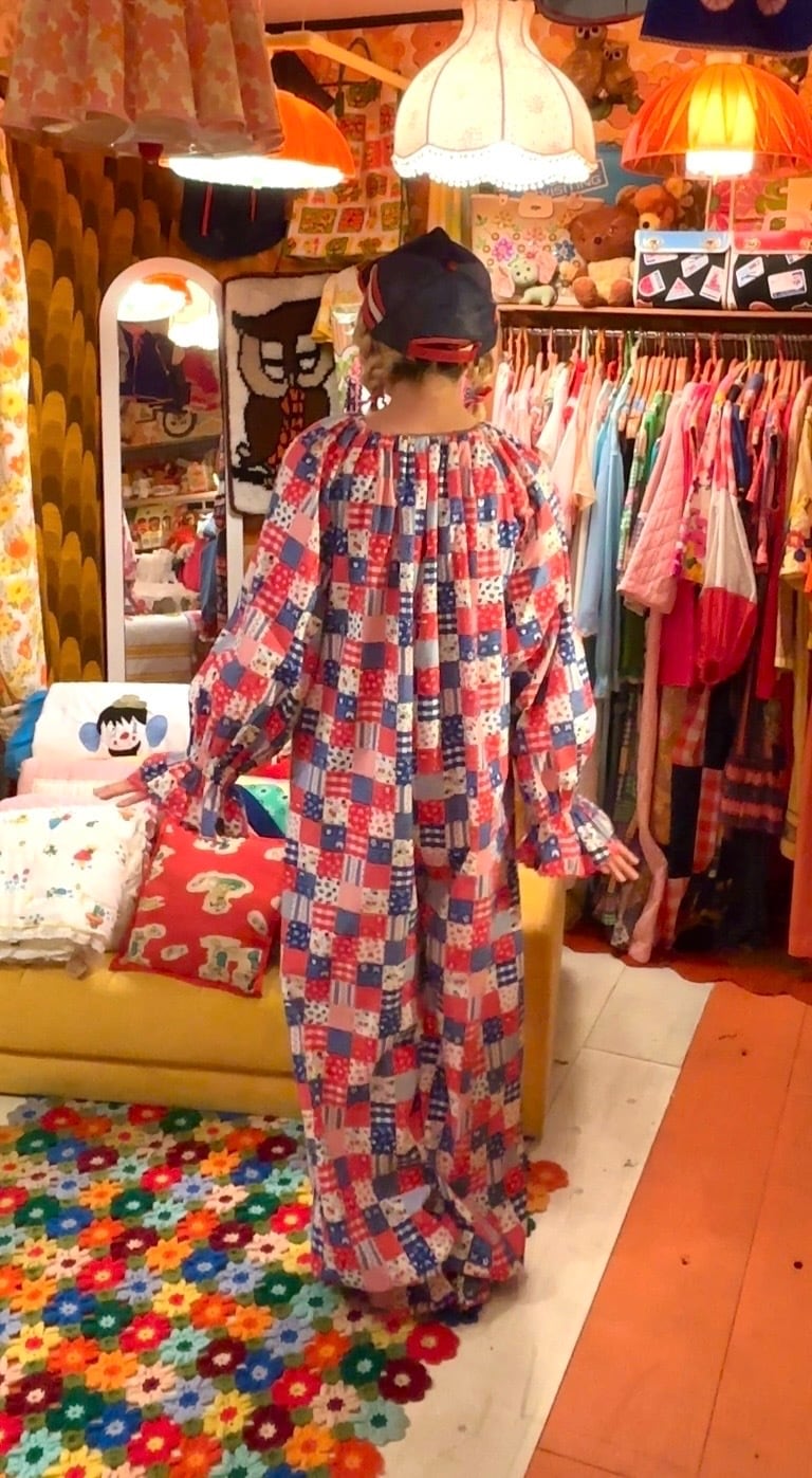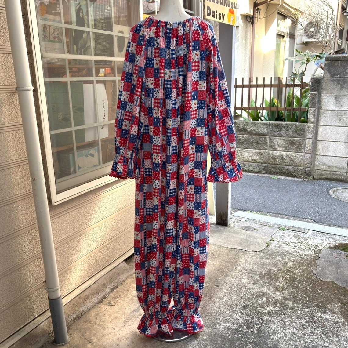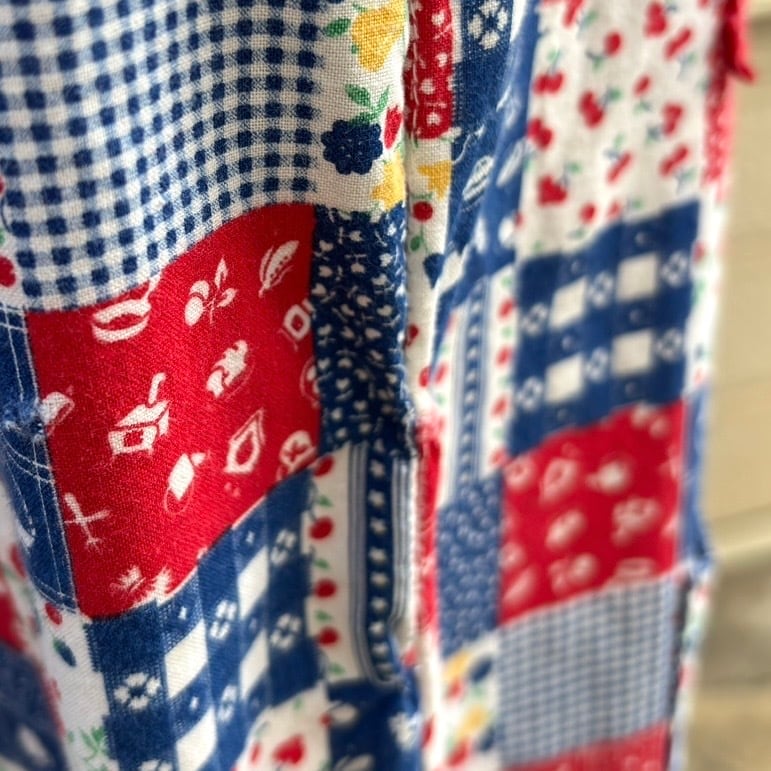 70年代 ヴィンテージ 当時のハンドメイド1点もの フルーツ&フラワー&カトラリー パッチワーク柄 ジャンプスーツです。