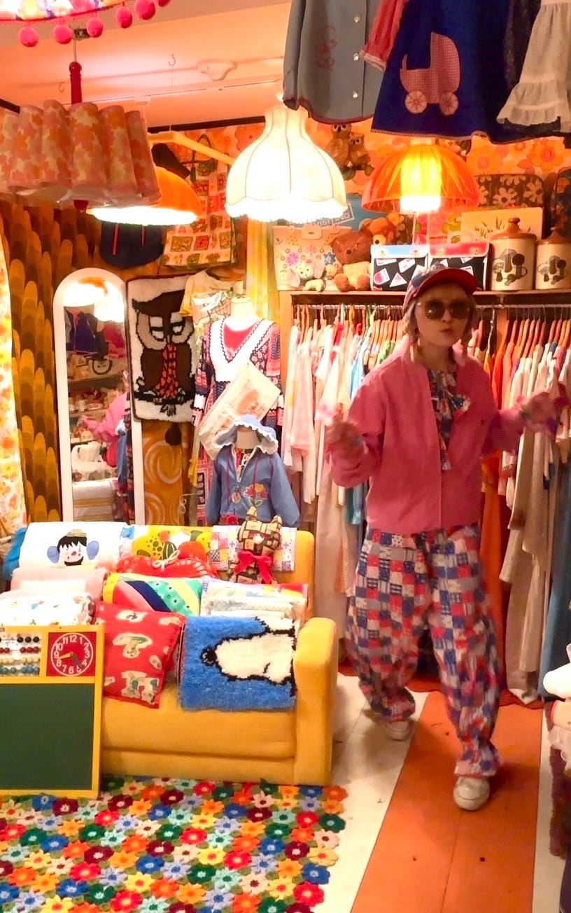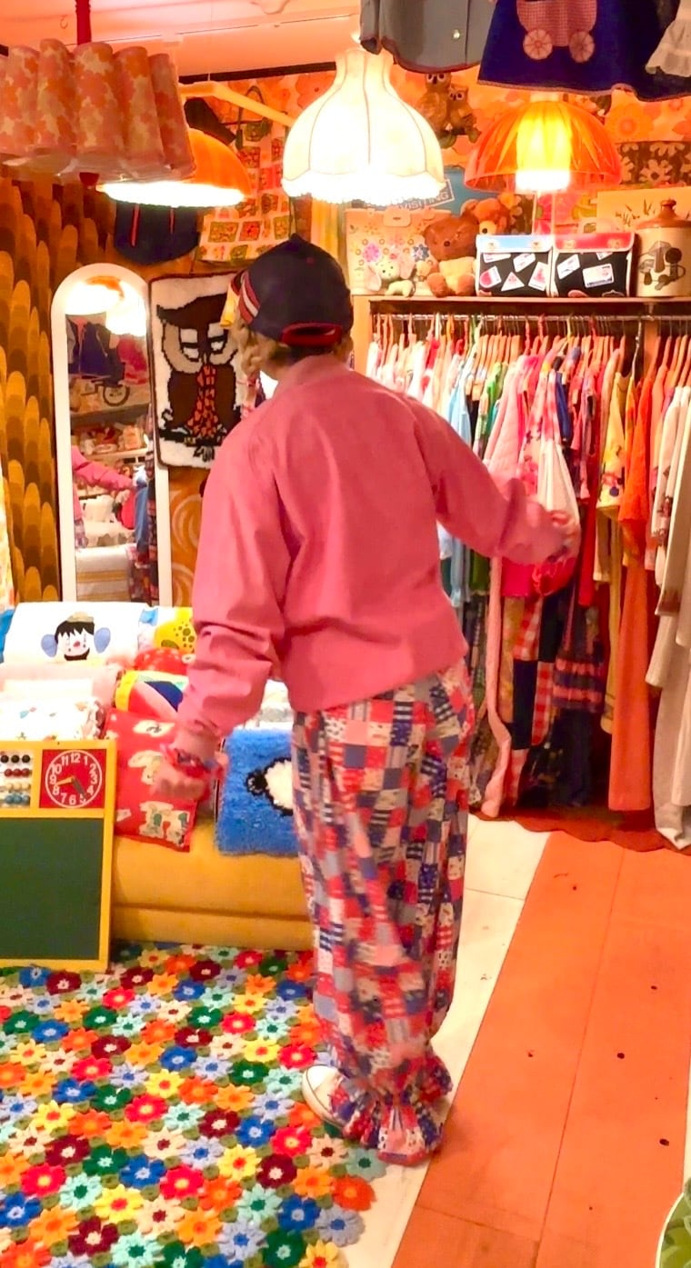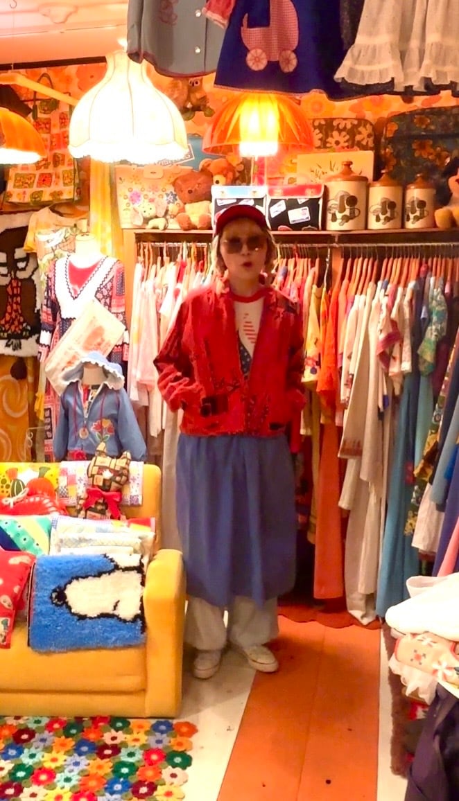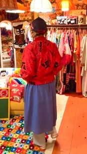 朱色よりのレッドのボディーにブラックカラーの雑誌の切り抜きのようなプリントとピンクレッドのシャンブレーのリバーシブルなデザインがとっても可愛い1着です。
