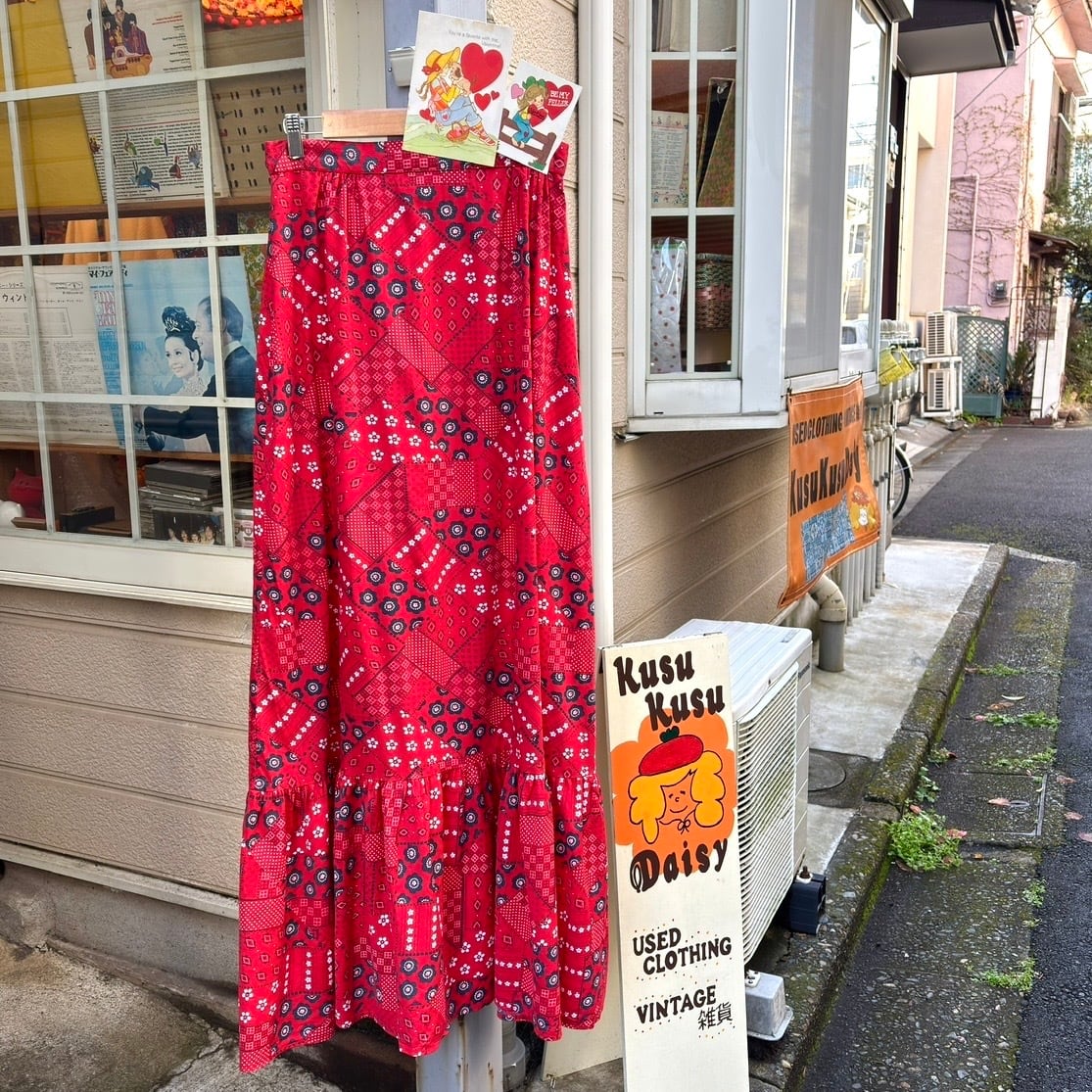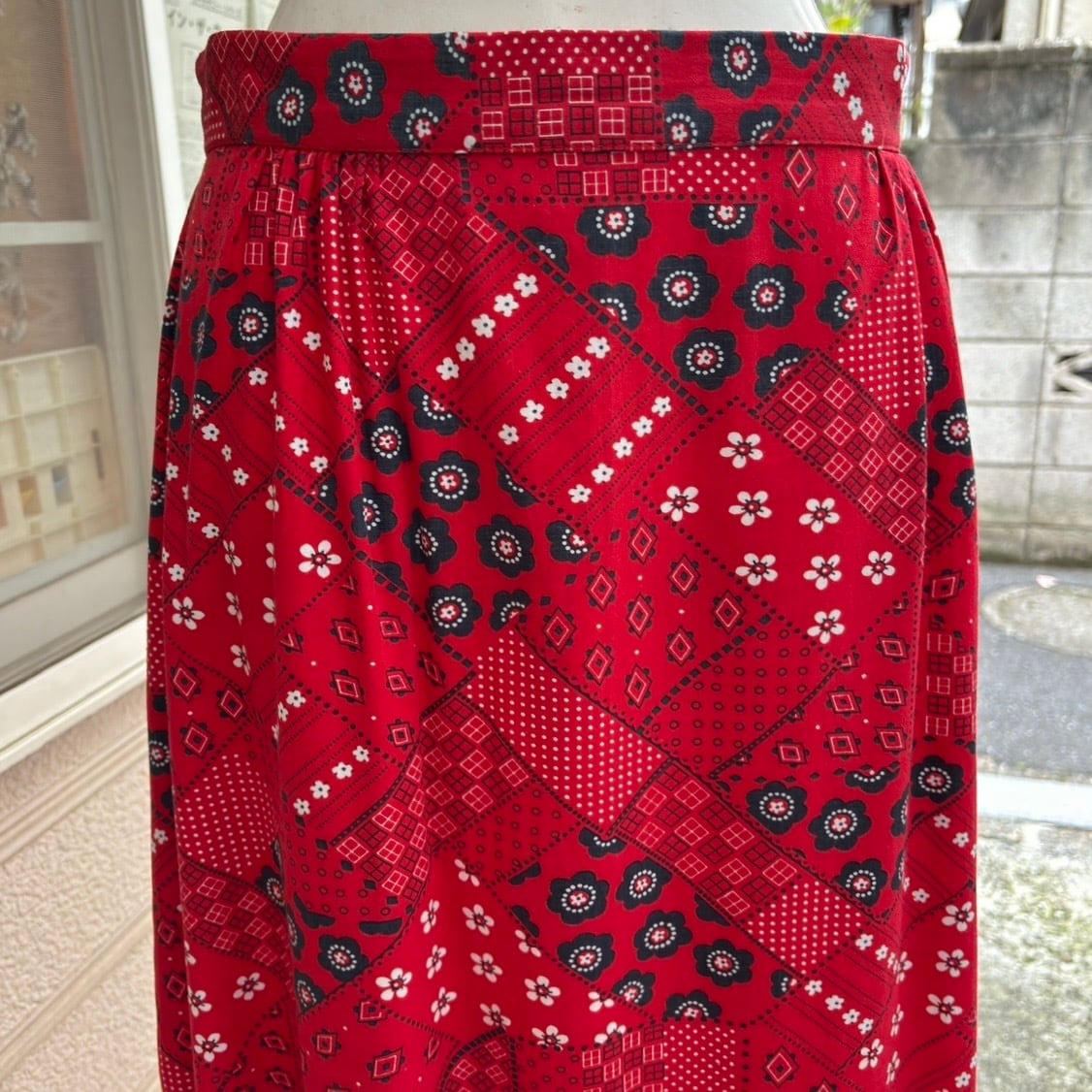 レッドベースにホワイト、ブラックのカラーリング、フラワー模様などのバンダナのようなパッチワーク柄がとっても可愛い1着です。