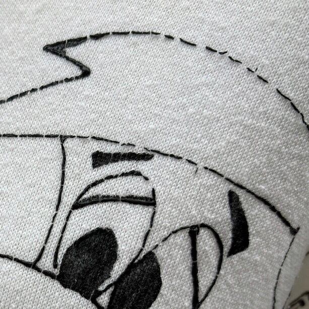メンテナンスはしましたが、経年による多少の毛羽立ち、所々キャラクターの線に割れ、左袖口にホールのリペア、フロント左袖のアームホール近くに点のようなシミが3カ所、背面側の左袖の袖口より少し上にごく僅かな薄っすらとしたシミ、背面側の中央より少し左側に薄っすらとしたシミがありますが、とてもレアでコレクタブルな1着かと思います。