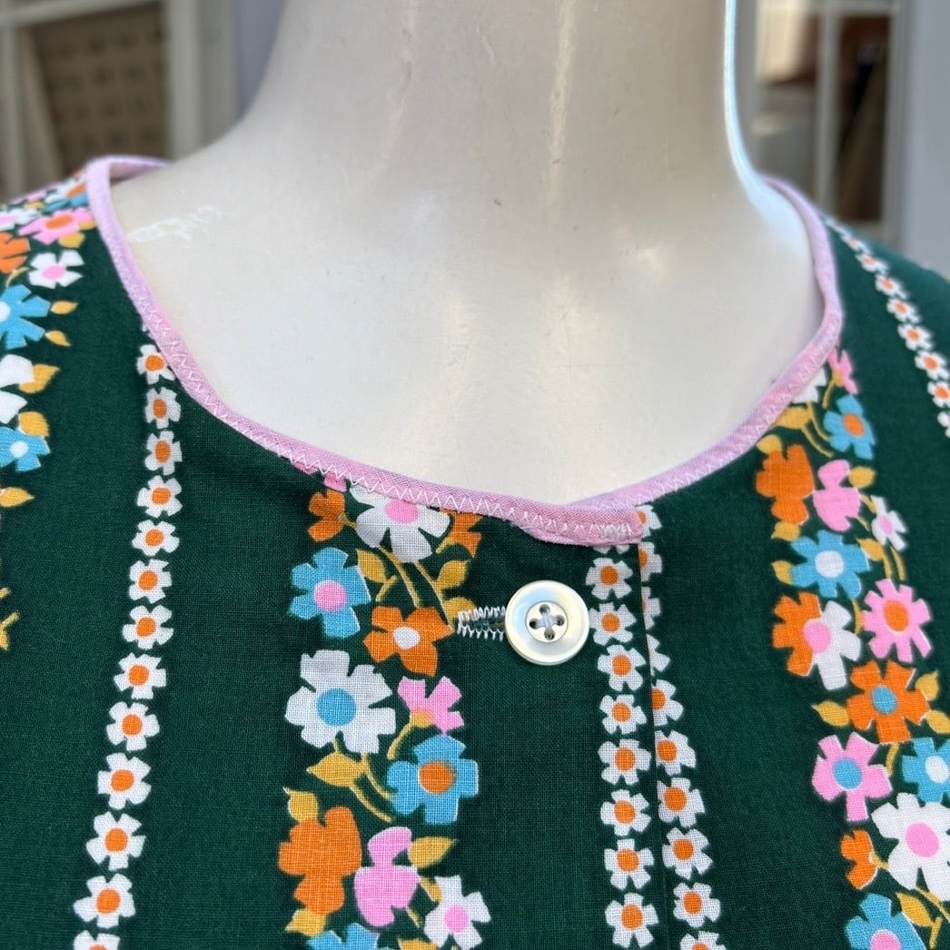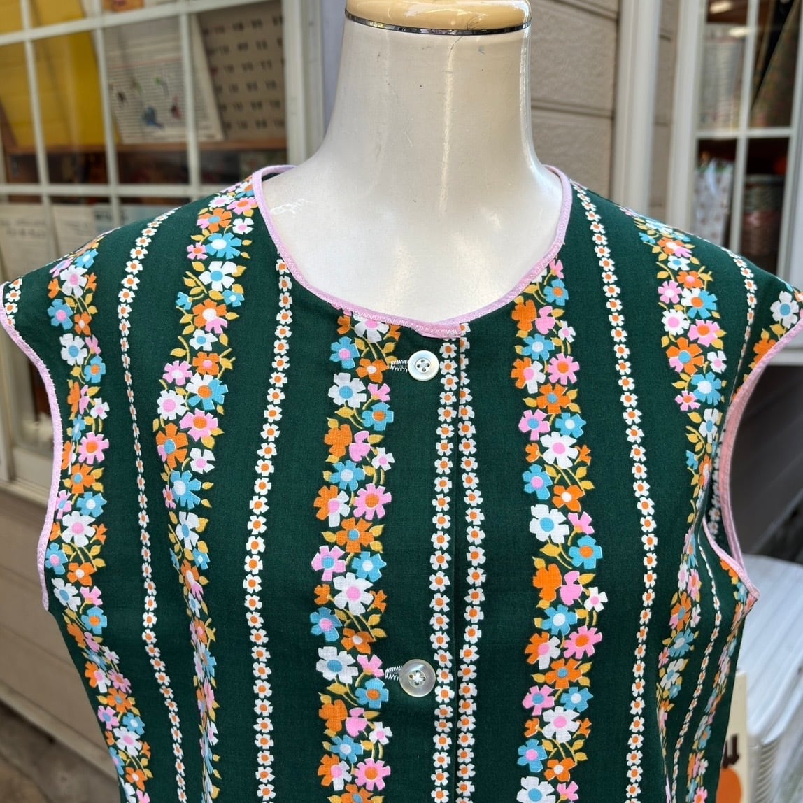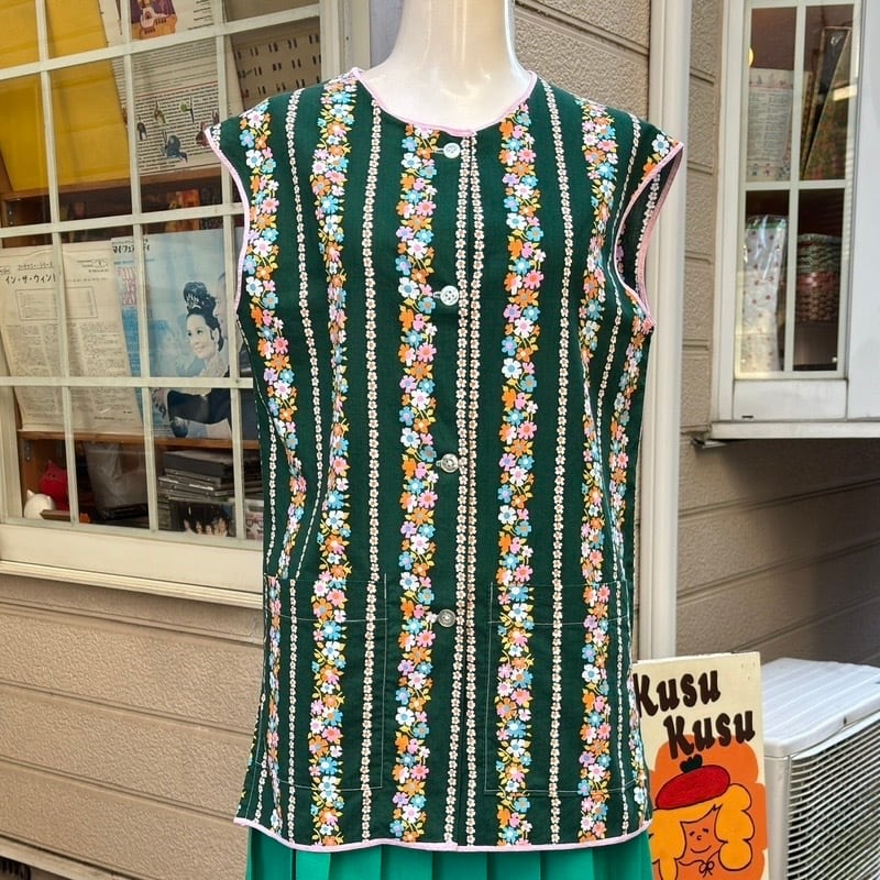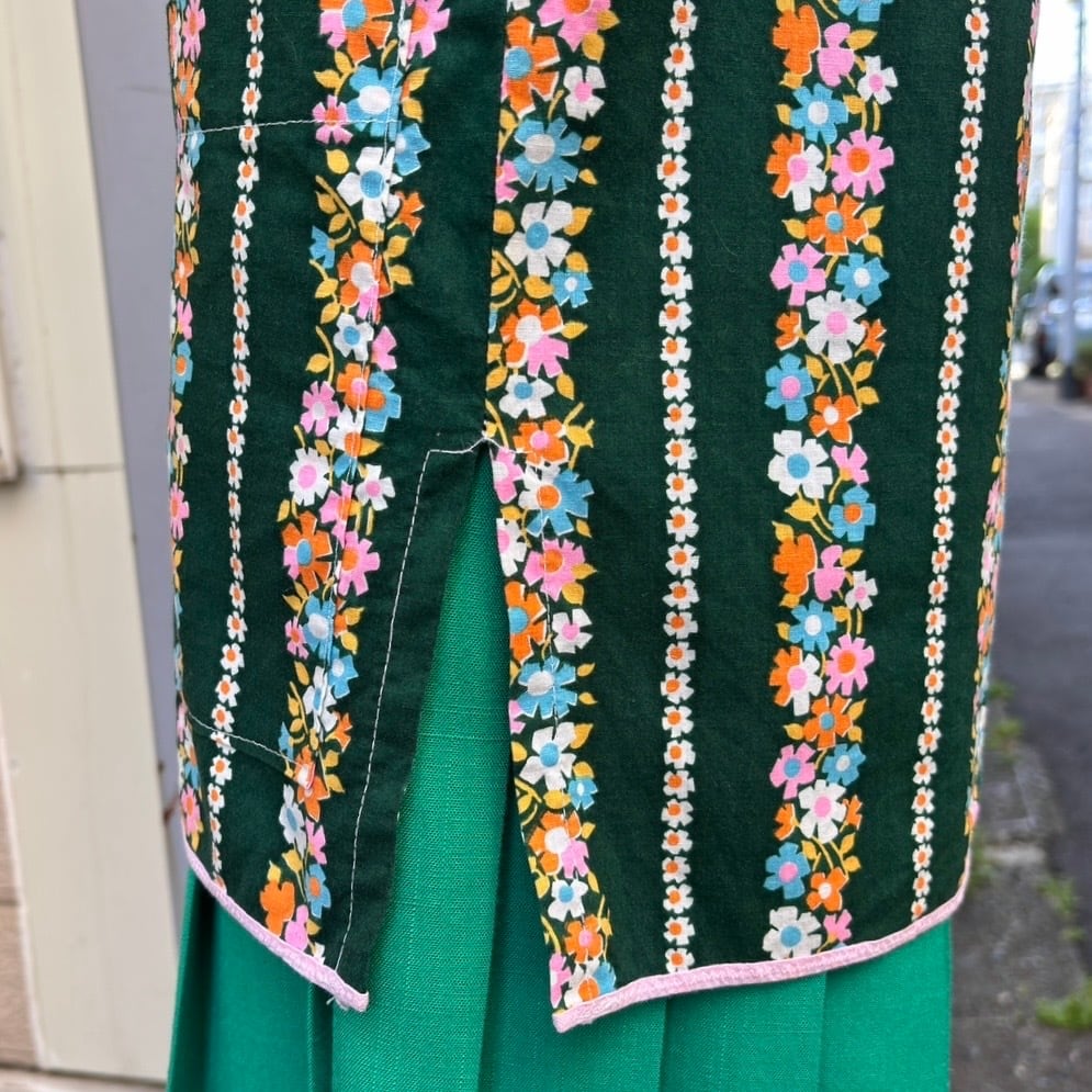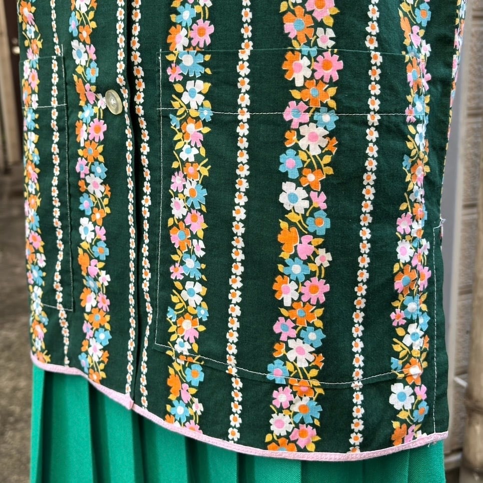 70年代 ヴィンテージ 当時のハンドメイド1点もの フラワー柄 エプロントップと70年代 ヴィンテージ グリーン プリーツスカートの2アイテムのセットです。