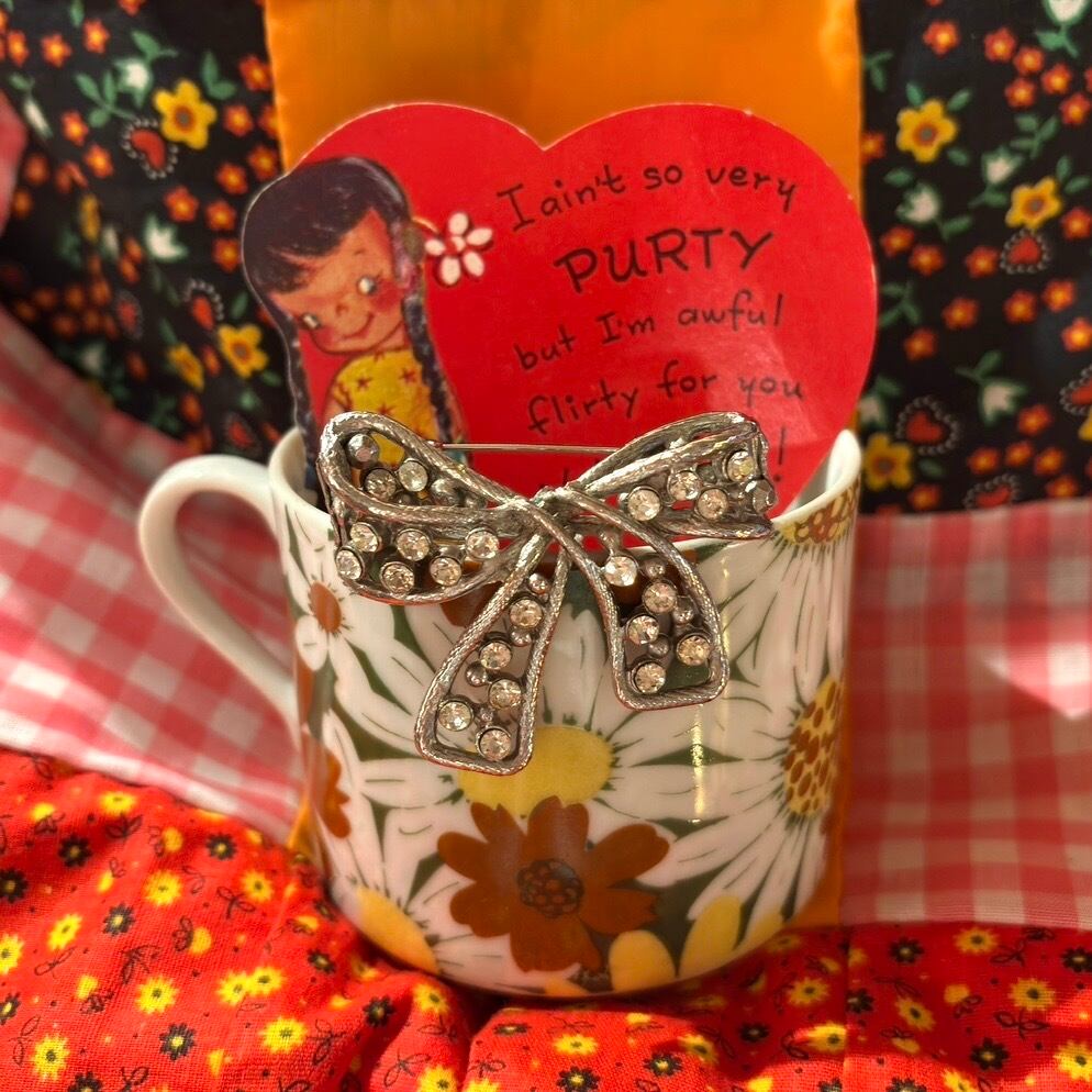 オリーブグリーンベースにホワイト、ブラウン、ライトイエローのヴィンテージならではなカラーリングやフラワー柄がとっても可愛いアイテムです。