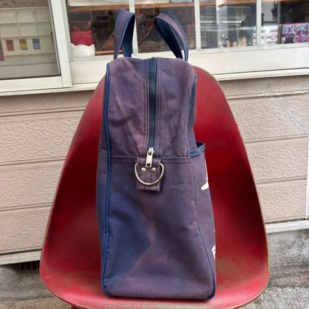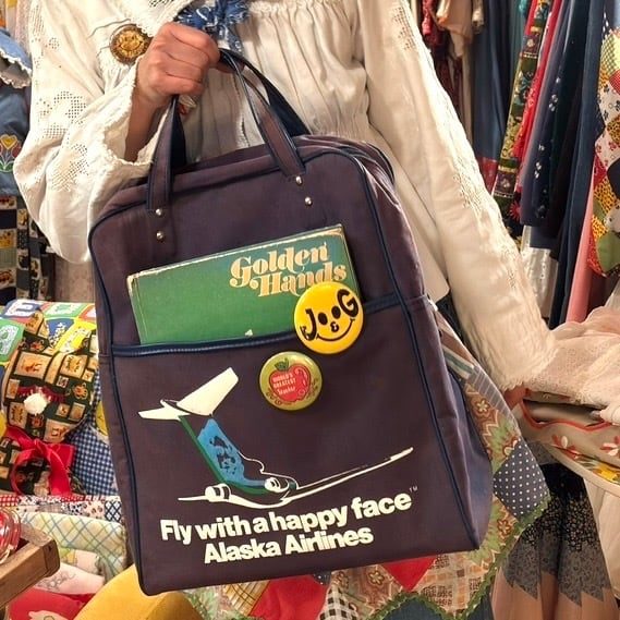 ネイビーのボディーに縦長のフォルム、アラスカ航空の広告のスローガンのFly with a happy face(にこにこ笑顔で楽しく飛行機に乗ろう)というニュアンスのロゴや飛行機のプリントが両面にありヴィンテージならではな雰囲気のあるアイテムです。