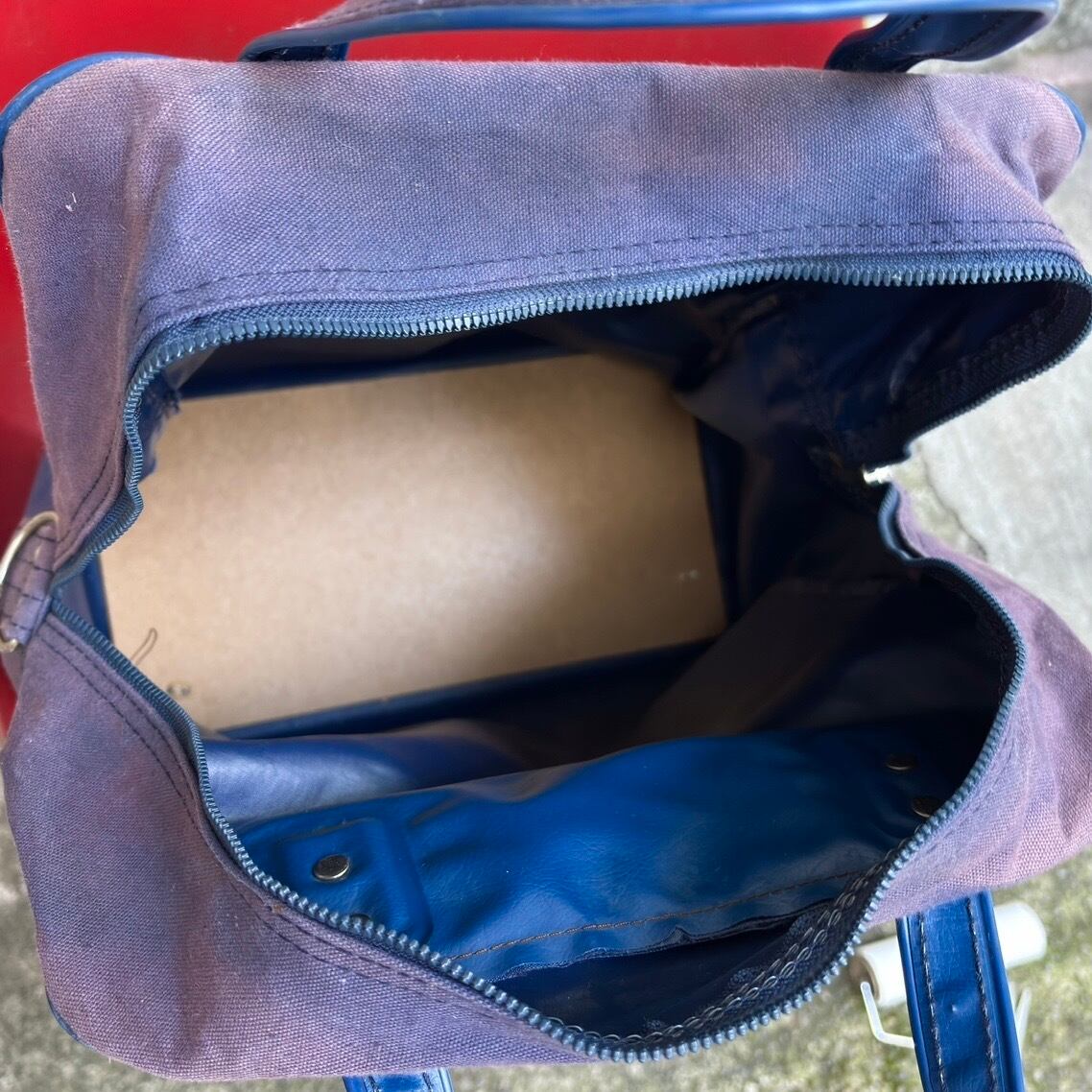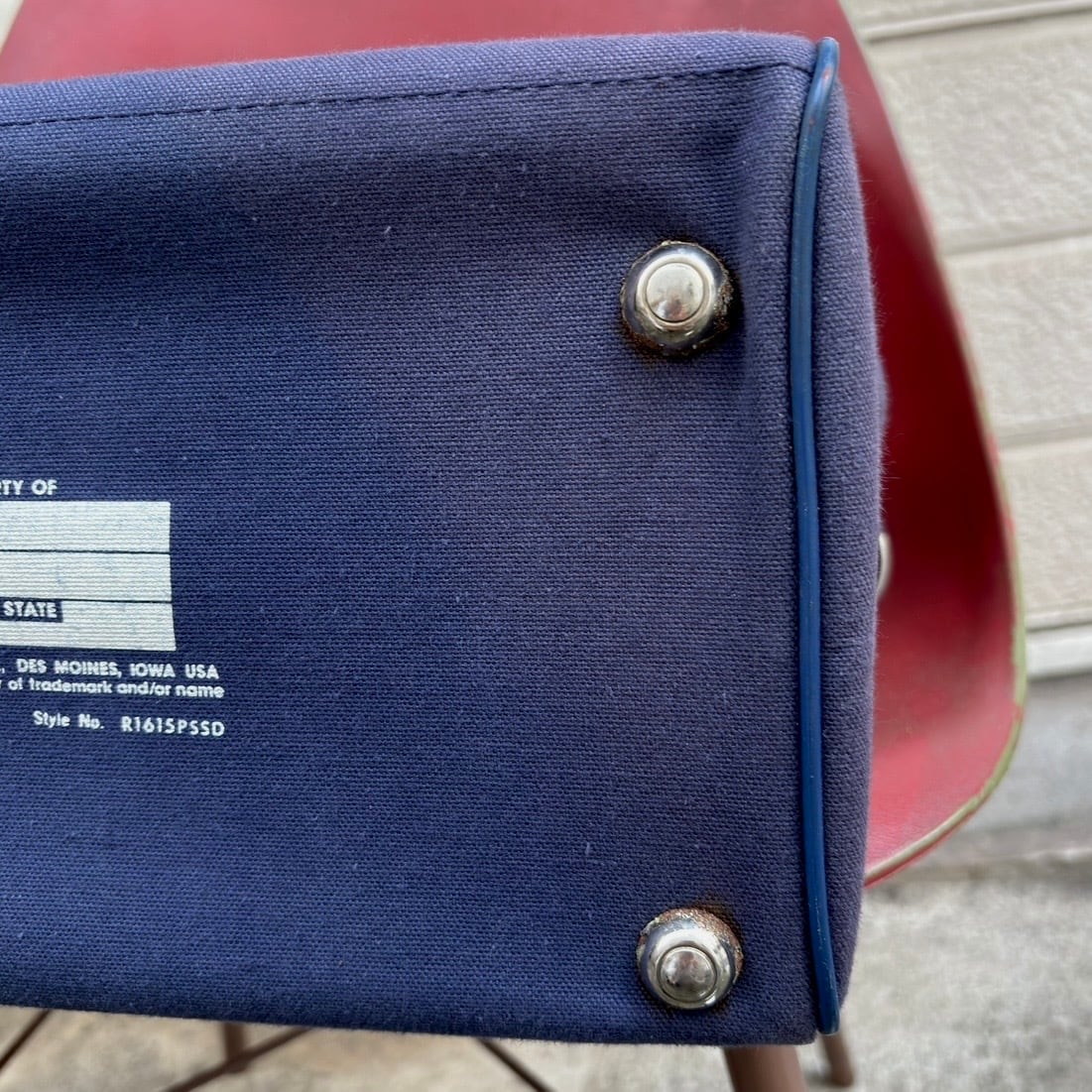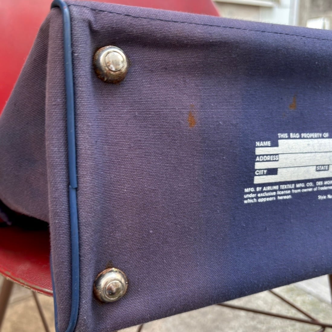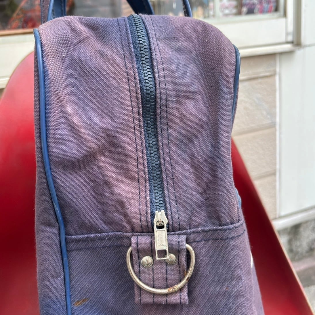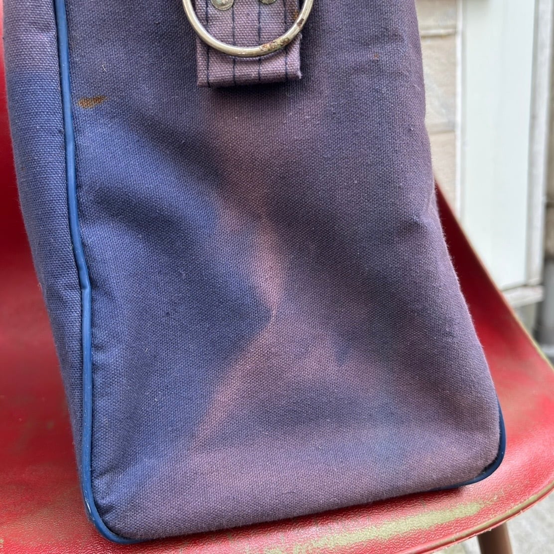 ネイビーのパイピングに僅かな擦れ、金具(留め具や脚、リング)に錆び、両サイドの若干のよれ、色褪せによる色むらや引っ掛かりのような毛羽立ちなど経年感はありますが、ヴィンテージならではなあじとして捉えて頂けたらと思います。